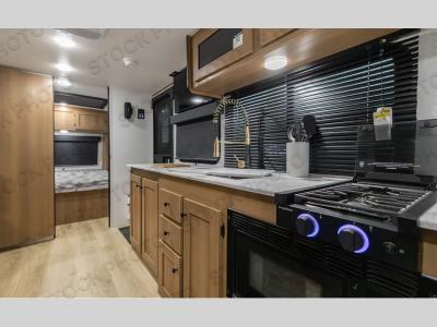As you step into this trailer, you're welcomed by a private front bedroom featuring a comfortable queen bed, perfect for a restful night's sleep, in between dual wardrobes to neatly store your clothes and essentials. Moving to the center of the space, the dinette nestled in the slide-out offers a cozy spot to dine, gather, or convert into an extra-sleeping area if needed. Just beside it, the 10-cu. ft. refrigerator provides ample space to keep your groceries fresh. Opposite the dinette, the fully equipped kitchen makes cooking on the road a breeze, complete with a stainless-steel sink with a flush-mount cover, an air fryer microwave, and a two-burner cooktop. Toward the rear, you’ll find 48" x 74" double bed bunks, with the lower bunk able to flip up for added flexibility, perfect for accommodating the whole crew. Adjacent to the bunks, a full bathroom adds extra convenience, eliminating the need to rely on campground facilities.