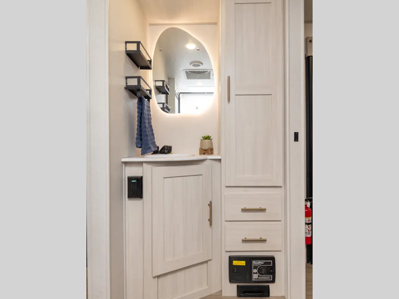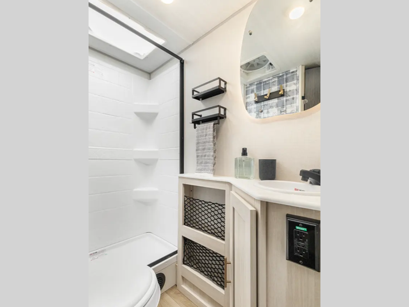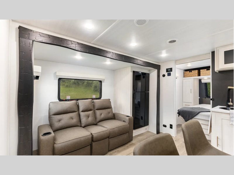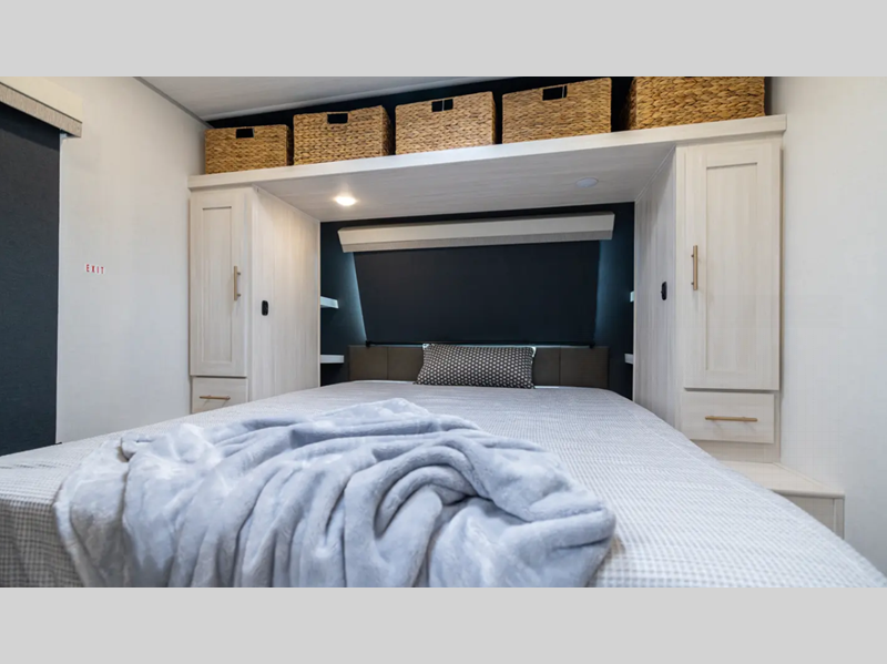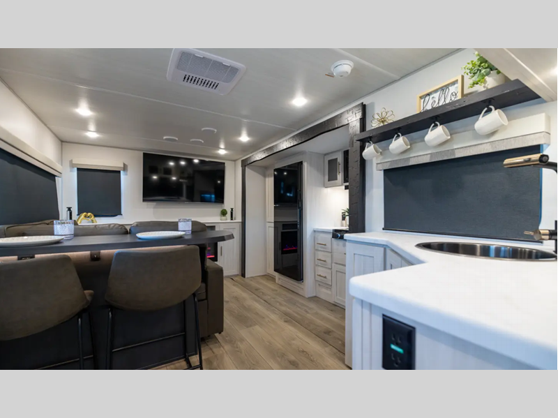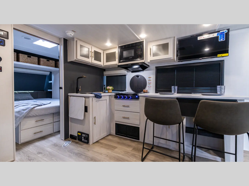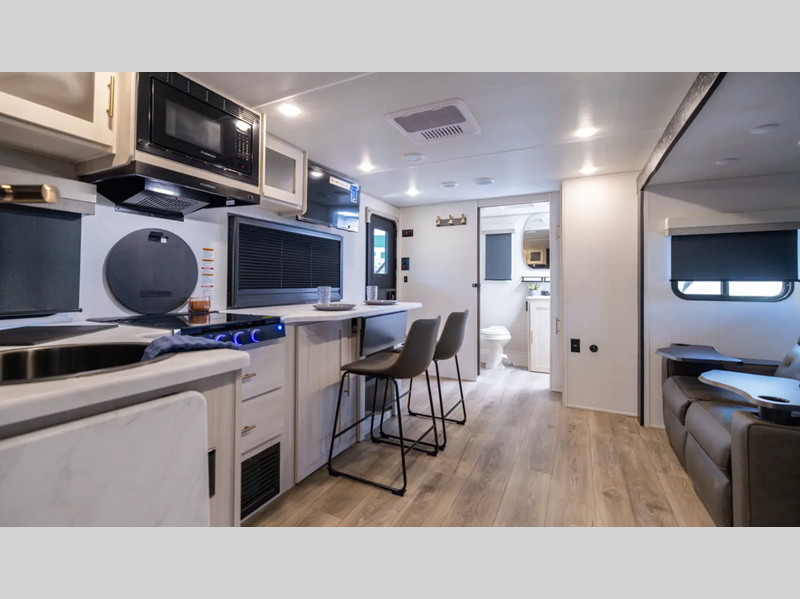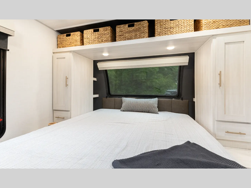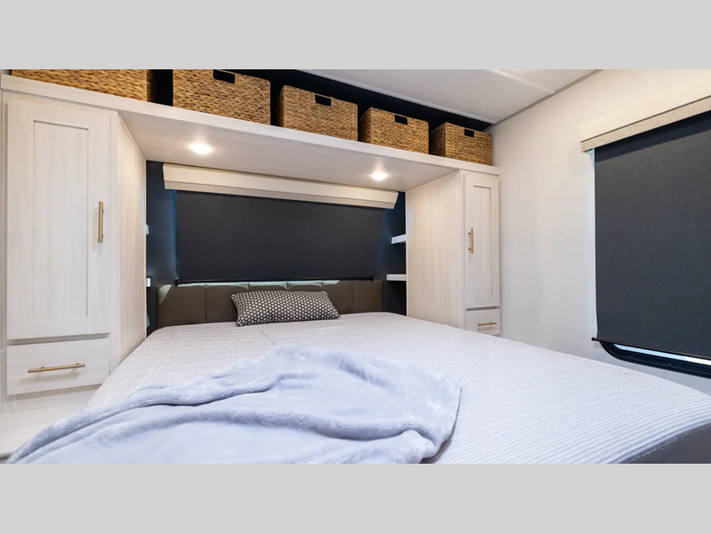 The aluminum framed floor with block foam insulation ensures exceptional structural integrity and thermal efficiency for comfortable travels in diverse climates, along with the sealed underbelly with forced heat & radiant foil barrier that provides superior insulation and heat management, ideal for chilly nights or cooler regions. Inside, you will find seamless Surf-X kitchen countertops that offer a sleek, durable surface and are easy to maintain for busy travelers. Further, the blackout roller shades will add privacy and light control for restful nights and cozy daytime retreats.