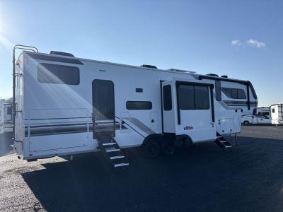 Sleeps 9 Slides 4 Length 42 ft 8 in Ext Width 8 ft 5 in Ext Height 13 ft 5 in Int Height 8 ft 5 in Hitch Weight 2700 lbs GVWR 19000 lbs Dry Weight 16000 lbs Fresh Water Capacity 83 gals Grey Water Capacity 106 gals Black Water Capacity 106 gals Tire Size ST215/75R 17.5 LRH Furnace BTU 35000 btu Number Of Bunks 2 Available Beds Queen Refrigerator Type 12 Volt Refrigerator Size 16 cu ft Cooktop Burners 3 Shower Size 48" x 30" Number of Awnings 2 Axle Weight 7000 lbs LP Tank Capacity 30 lbs Water Heater Type Tankless AC BTU 30000 btu TV Info LR LED Smart TV, BR LED TV Awning Info 7' and 14' 5" Power w/Integrated LED Lighting Axle Count 2 Washer/Dryer Available Yes Number of LP Tanks 2 Shower Type Standard Electrical Service 50 amp Solar Wattage 330 watts Similar Fifth Wheel Floorplans