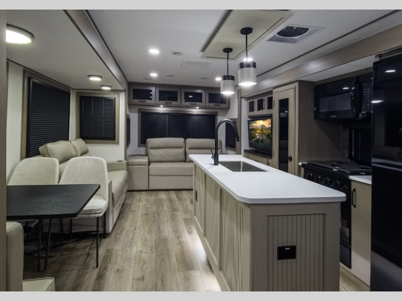 Sleeps 5 Slides 2 Length 35 ft 5 in Ext Width 8 ft Ext Height 11 ft 11 in Hitch Weight 1145 lbs GVWR 10995 lbs Dry Weight 9518 lbs Fresh Water Capacity 55 gals Grey Water Capacity 78 gals Black Water Capacity 39 gals Tire Size ST225/75R15LRE Furnace BTU 35000 btu Available Beds Queen Refrigerator Type 12V Refrigerator Size 16 cu ft Cooktop Burners 3 Shower Size 30" x 48" Number of Awnings 1 LP Tank Capacity 30 lbs Water Heater Type On Demand Tankless AC BTU 28500 btu TV Info LR 40" LED HDTV Awning Info 12' One-Touch Electric LED Axle Count 2 Washer/Dryer Available Yes Number of LP Tanks 2 Shower Type Standard Electrical Service 50 amp Solar Wattage 180 watts Similar Floorplans