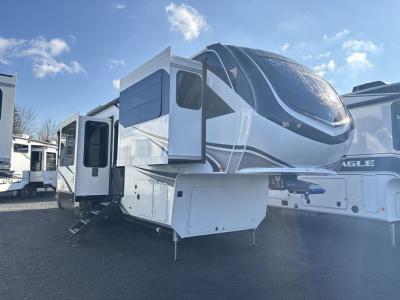 Sleeps 6 Slides 5 Length 41 ft 4 in Ext Width 8 ft 5 in Ext Height 13 ft 5 in Int Height 8 ft 1 in Exterior Color Standard Graphics or Aurora, Midnight, Pearl Full-Body Paint Options Hitch Weight 3052 lbs GVWR 19000 lbs Dry Weight 14866 lbs Fresh Water Capacity 81 gals Grey Water Capacity 106 gals Black Water Capacity 106 gals Tire Size ST215/75R 17.5 LRH Furnace BTU 35000 btu Available Beds Queen Refrigerator Type 12V Refrigerator Size 20 cu ft Cooktop Burners 4 Shower Size 48" x 30" Number of Awnings 2 Axle Weight 8000 lbs LP Tank Capacity 30 lbs. Water Heater Type Tankless On Demand AC BTU 30000 btu TV Info LR LED Smart TV Awning Info 14' 5" and 15' 5" Power w/Integrated LED Lighting Axle Count 2 Washer/Dryer Available Yes Number of LP Tanks 2 Shower Type Shower w/Seat Electrical Service 50 amp Similar Fifth Wheel Floorplans