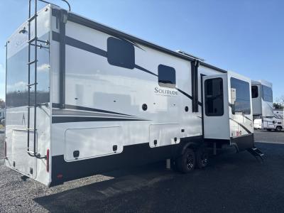 Each Solitude fifth wheel by Grand Design features a 101" wide-body construction, heavy duty 8,000 lb. axles, frameless tinted windows, and high-gloss gel coat sidewalls. You can camp year around thanks to the Weather-Tek Package that includes a 35K BTU high-capacity furnace, an all-in-one enclosed and heated utility center, and a fully enclosed underbelly with heated tanks and storage. Inside, you'll love the premium roller shades, hardwood cabinet doors, solid surface countertops, plus residential finishes throughout to make you truly feel at home. Each model also includes a MORryde CRE3000 suspension system, self adjusting brakes, and a MORryde pin box that will provide smooth towing from home to campground. Affordable luxury is possible with the Solitude fifth wheels; choose yours today!