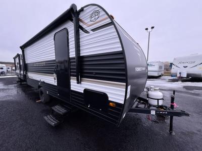 Go hiking, biking or exploring for new places when you have this trailer at the campgrounds! You will find sleeping for the family between the rear corner bunk beds, and the front bed with a with a shelf for your belongings and such. And even more can sleep on the dinette slide. You'll be delighted to cook in the kitchen on the two-burner stove, and there is a farmhouse sink for easy clean-up. The power awning provides a protected outdoor living area as you visit or make s'mores around the campfire.