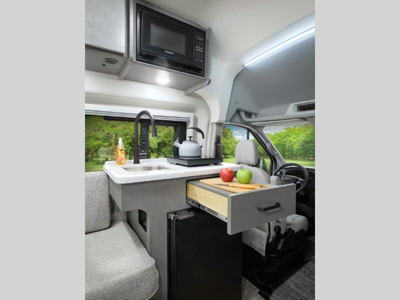 Sleeps 2 Length 20 ft 5 in Ext Width 8 ft 1 in Ext Height 10 ft 2 in Int Height 6 ft 7 in Interior Color Alpine White II, Charcoal Fusion II Exterior Color Avalanche Grey, Carbonized Grey, Oxford White Hitch Weight 6000 lbs GVWR 9500 lbs Fresh Water Capacity 23 gals Grey Water Capacity 20 gals Black Water Capacity 4.75 gals Tire Size 30.5" Furnace BTU 14300 btu Fuel Type Gasoline Engine 3.5L V6 Chassis Ford Transit Trail AWD Horsepower 310 hp Fuel Capacity 31 gals Wheelbase 148 in Torque 400 ft-lb Refrigerator Type Single Door 12V Electric Cooktop Burners 1 Number of Awnings 1 LP Tank Capacity 24.7 lbs Water Heater Capacity 2.64 gal Water Heater Type Truma Combi Eco AC BTU 11000 btu Awning Info 10' Thule Lateral Arm w/ Integrated LED Lighting Gross Combined Weight 12600 lbs Shower Type Wet/Bath Shower Electrical Service 30 amp Solar Wattage 200 watts -