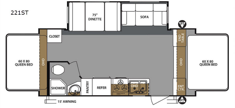 Are you ready for your next camping trip? Come see just how easy and fun camping can be with this Surveyor 221ST expandable. Along the rear and the front there are expandable queen beds. You will enjoy the extra floor space inside this model thanks to the slide out along the roadside. Within the slide out there is a sofa and a 75" dinette where you can sit and visit or use these for additional sleeping space. Outside there is a 15' awning plus a pass through storage area where you can easily store all of your camping gear and more!